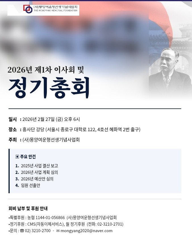 2. ¿À´Â 2026³â 2¿ù 27ÀÏ(±Ý) ¿ÀÈÄ 6½ÃºÎÅÍ Èï»ç´Ü 3Ãþ °´ç¿¡¼ Çϱâ¿Í °°Àº ¾È°ÇÀ¸·Î Á¤±âÃÑȸ¸¦ °³ÃÖÇϰíÀÚ ÇÏ¿À´Ï Âü¼®ÇÏ¿© Áֽñ⠹ٶø´Ï´Ù.